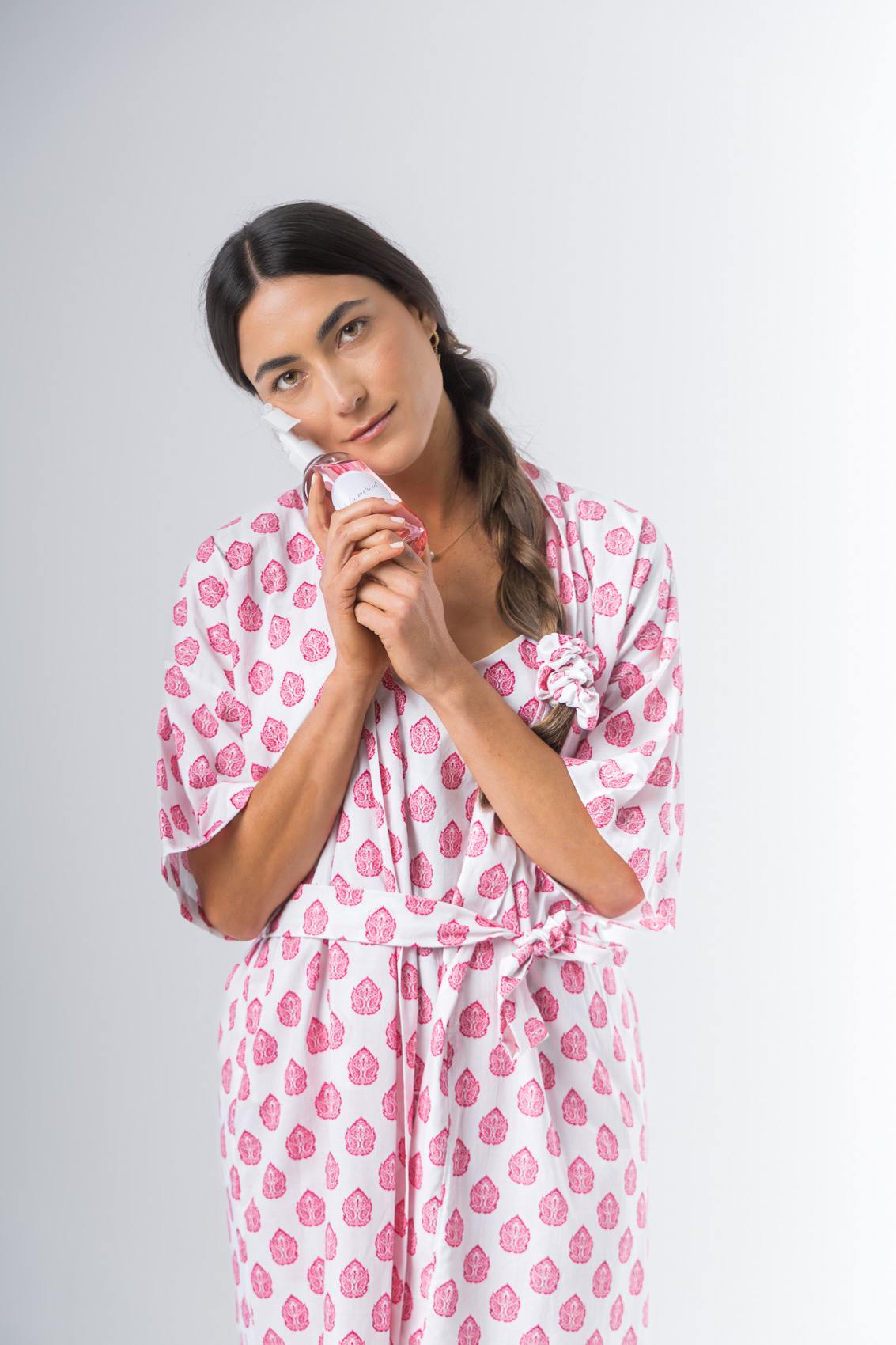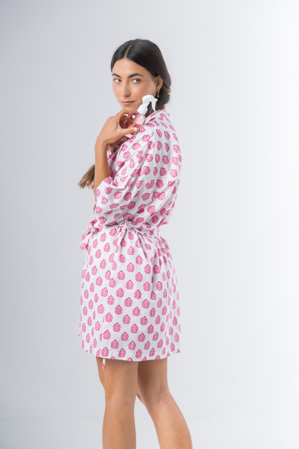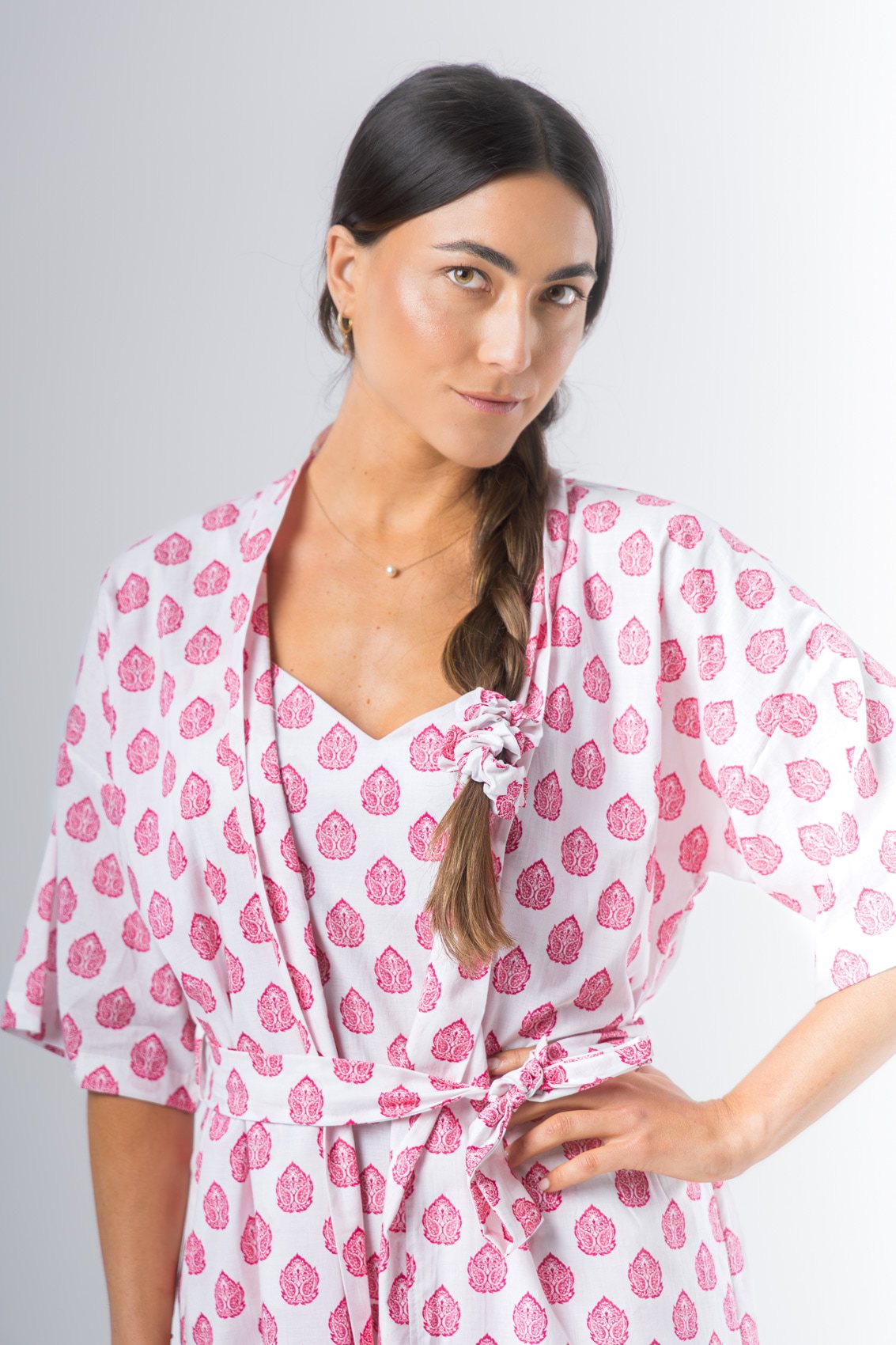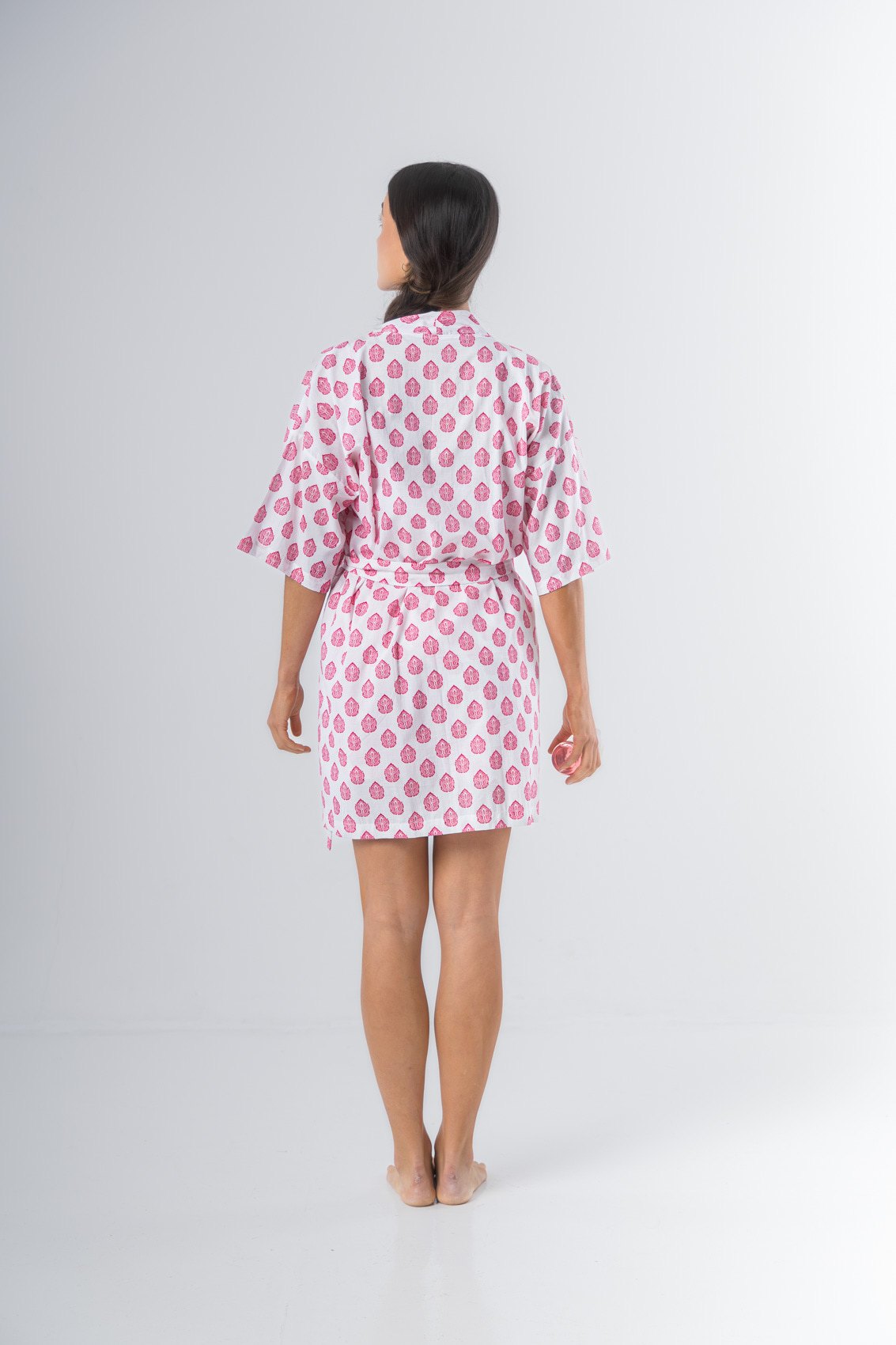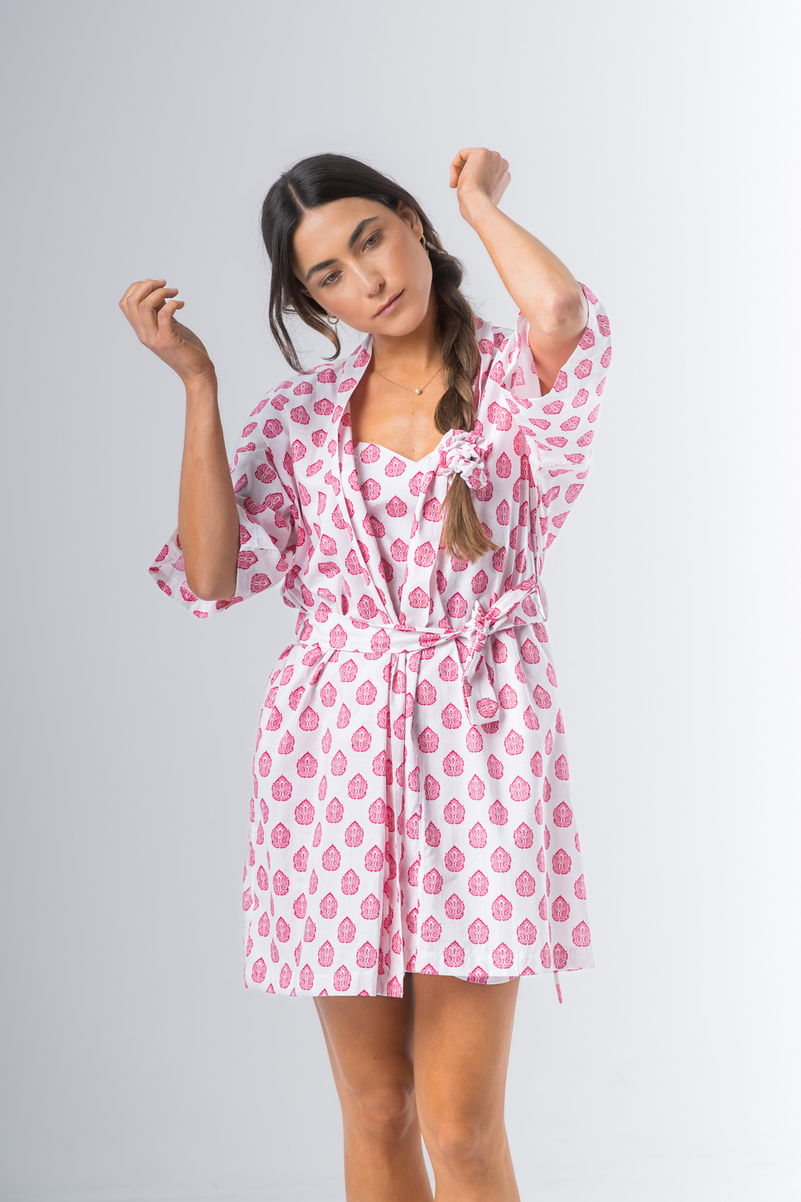 Kimono confeccionado en algodón estampado, manga al codo, largo arriba de la rodilla. Lazo de algodón estampado.