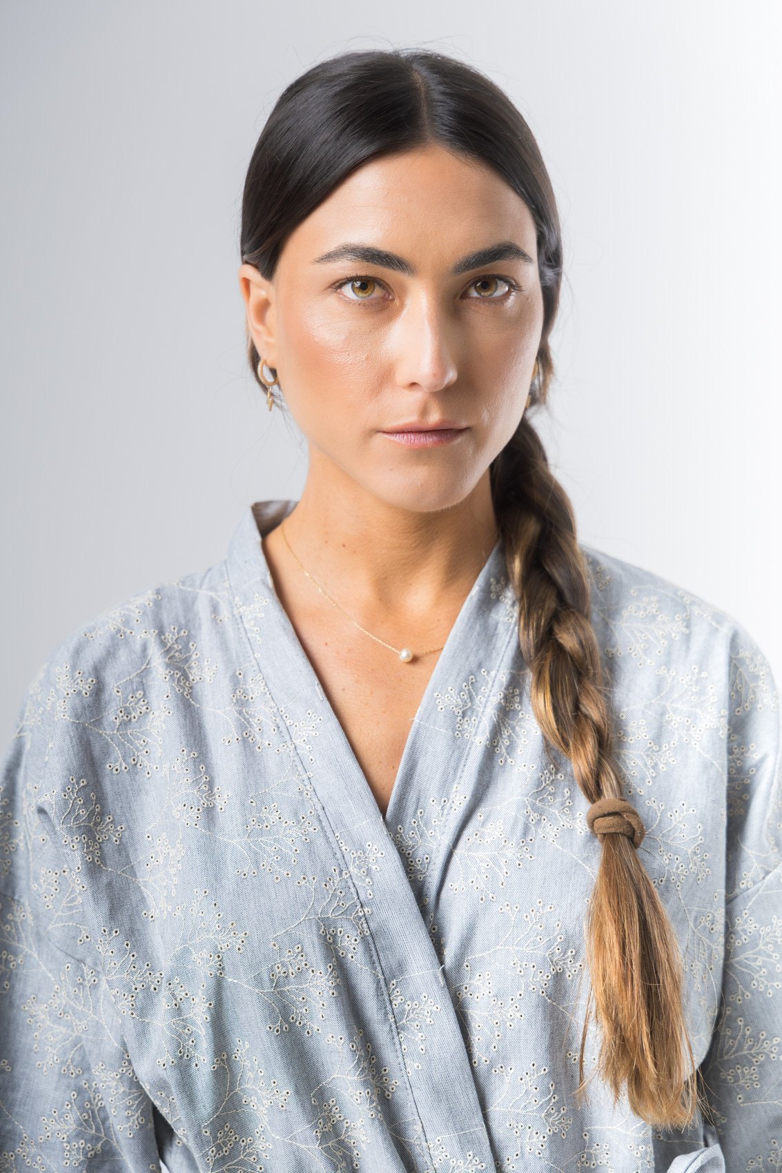 Kimono confeccionado en broderie de algodón, manga al codo, largo arriba de la rodilla. Lazo de broderie de algodón.
