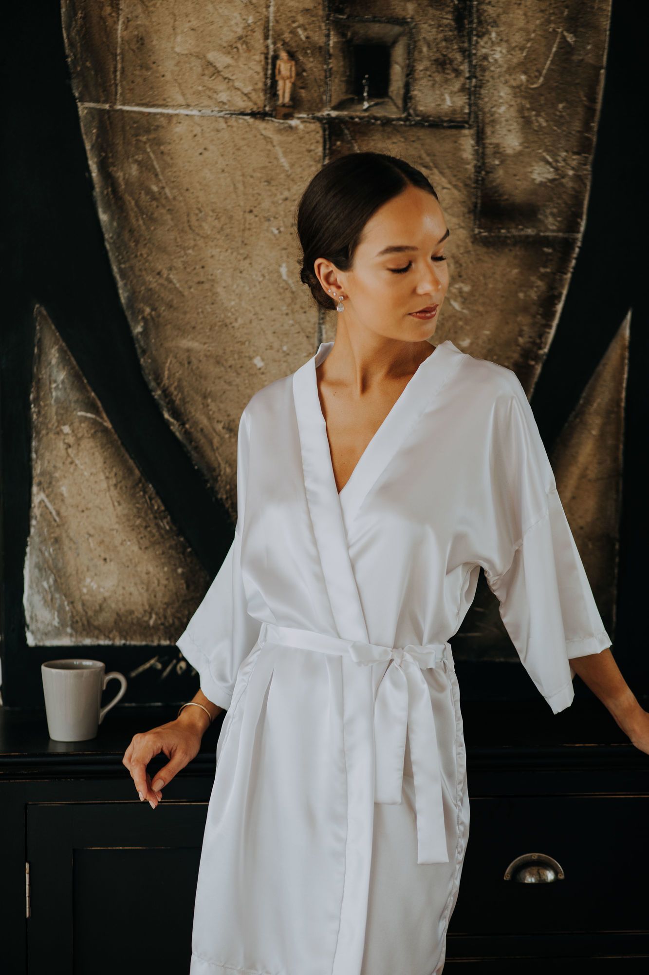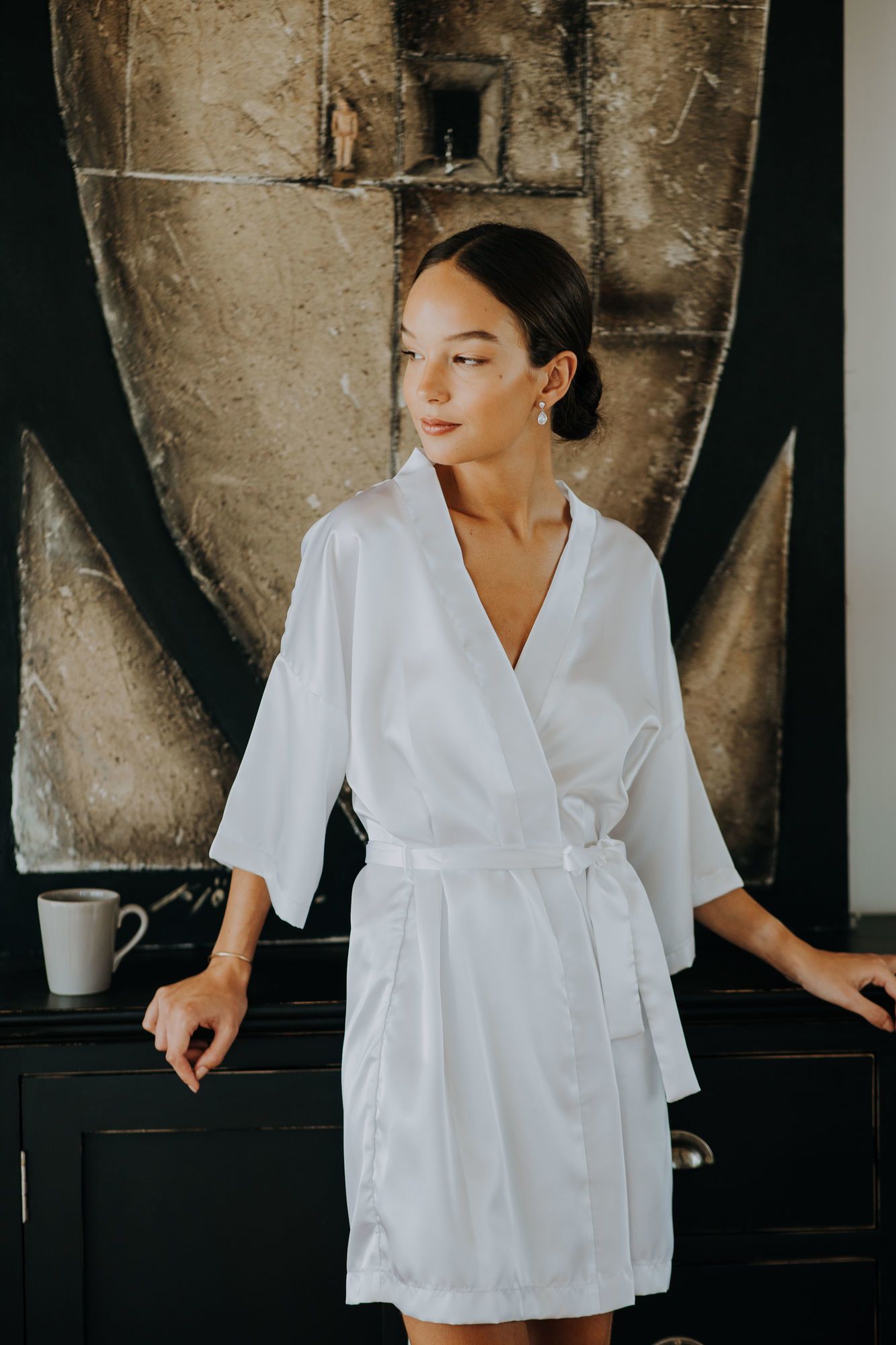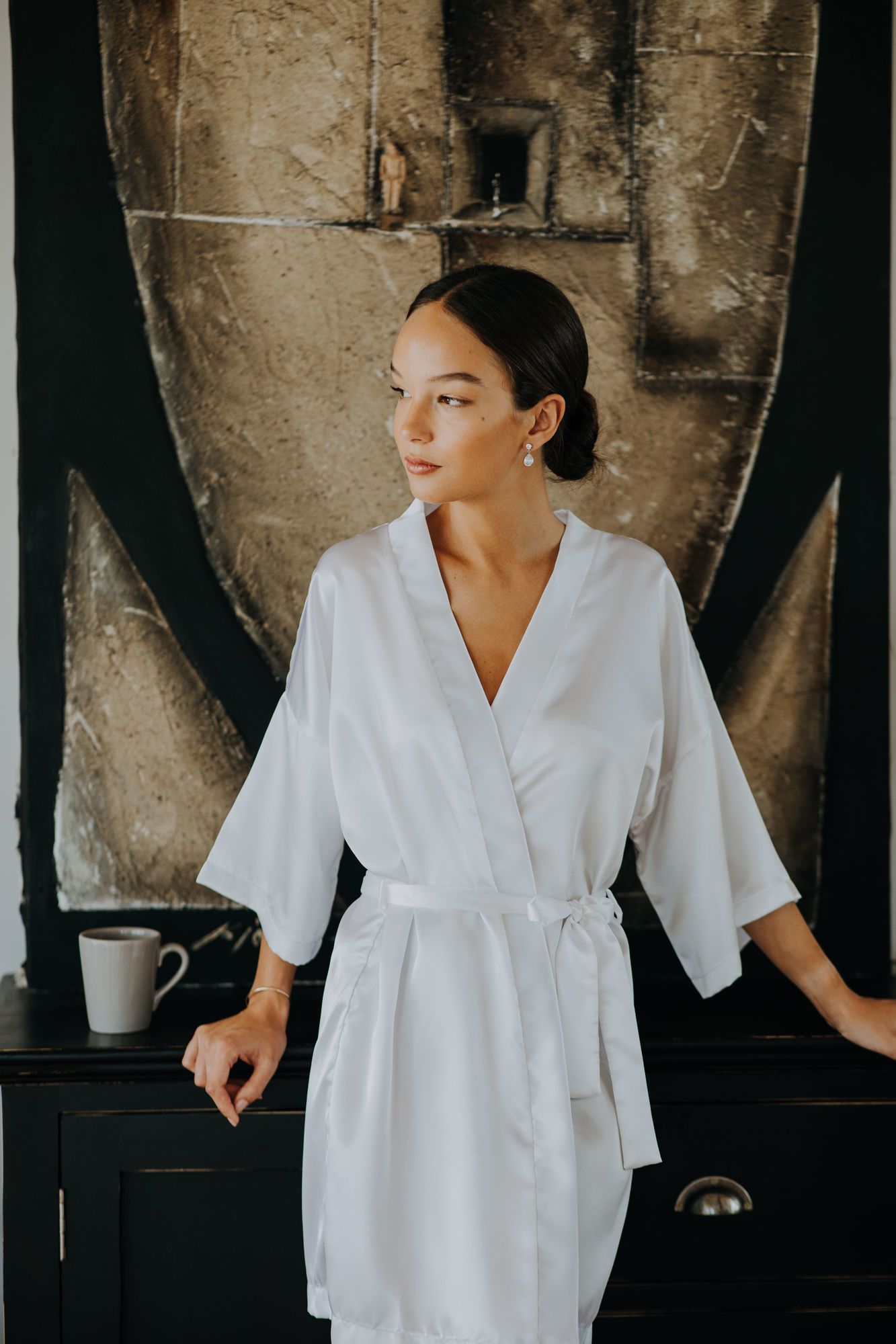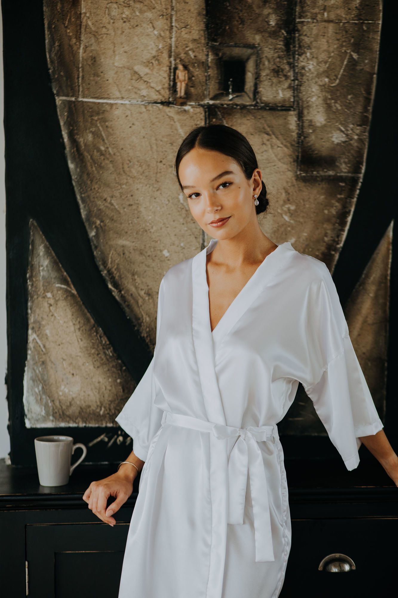 Kimono confeccionado en satin elastizado, manga al codo, largo arriba de la rodilla. Lazo de satin.