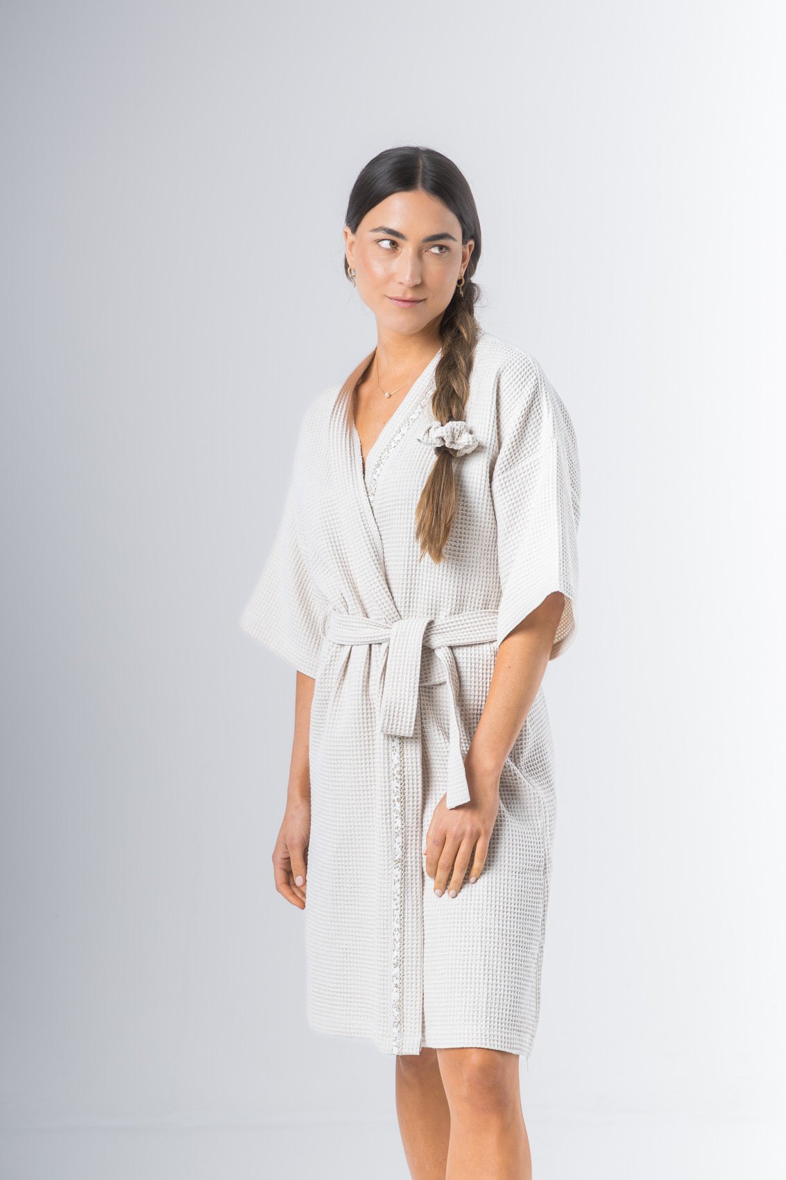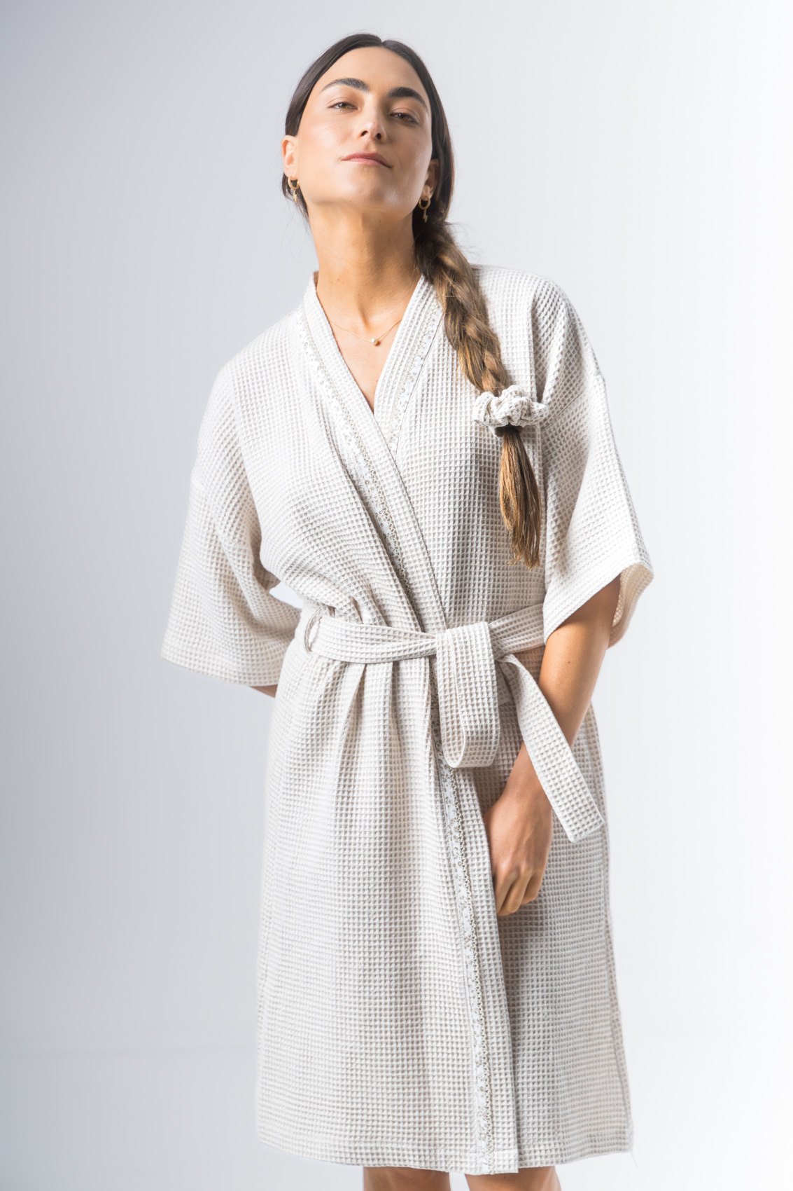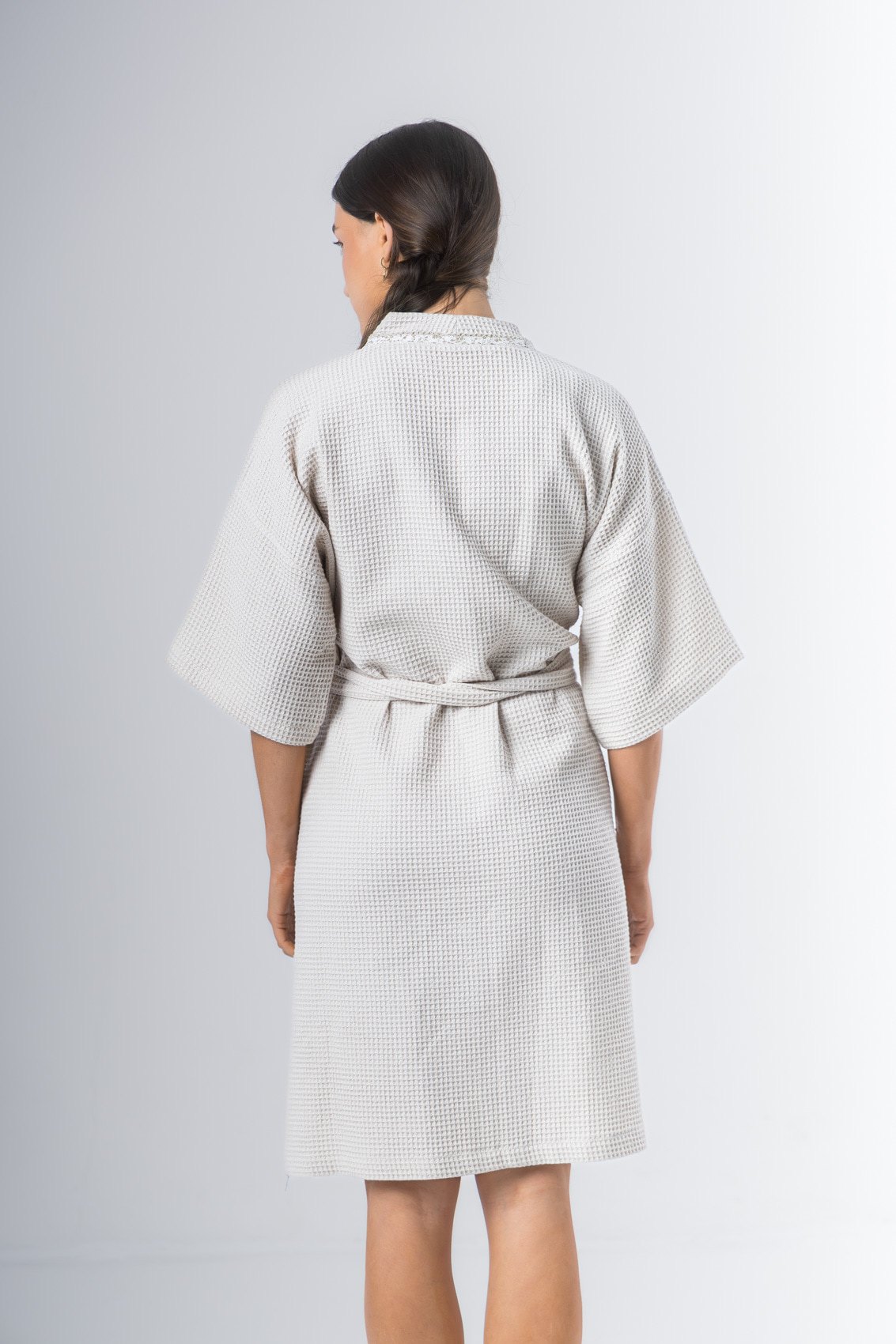 Kimono confeccionado en tela waffle de algodón, manga al codo, largo arriba de la rodilla. Detalle de vivo en solapa. Lazo de tela waffle de algodón.