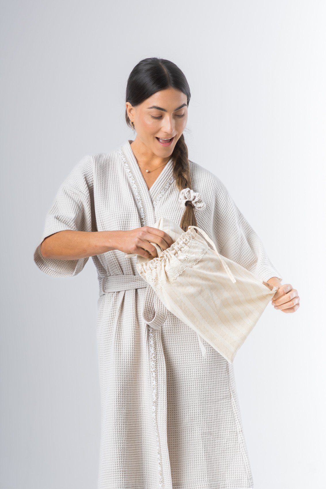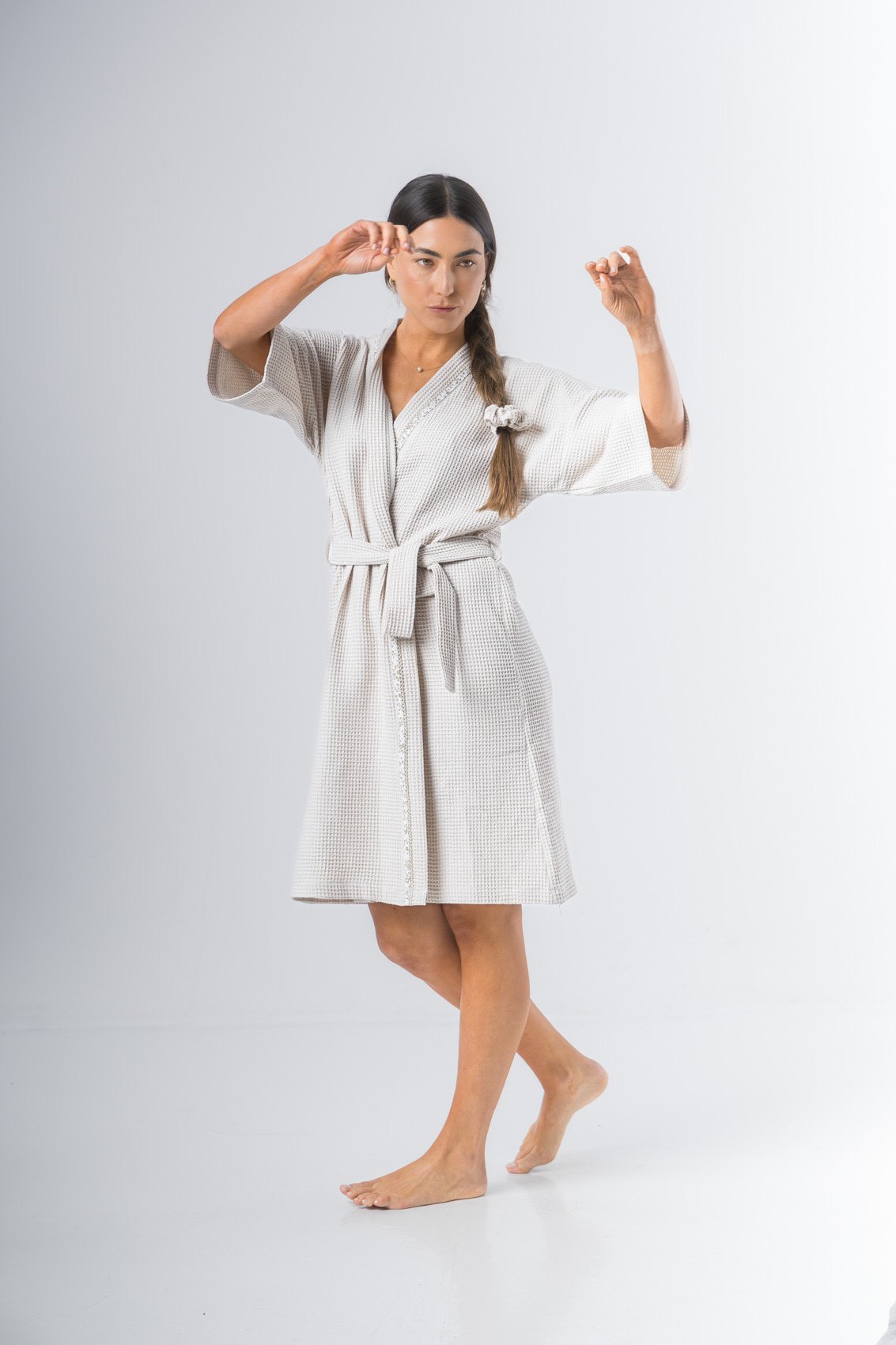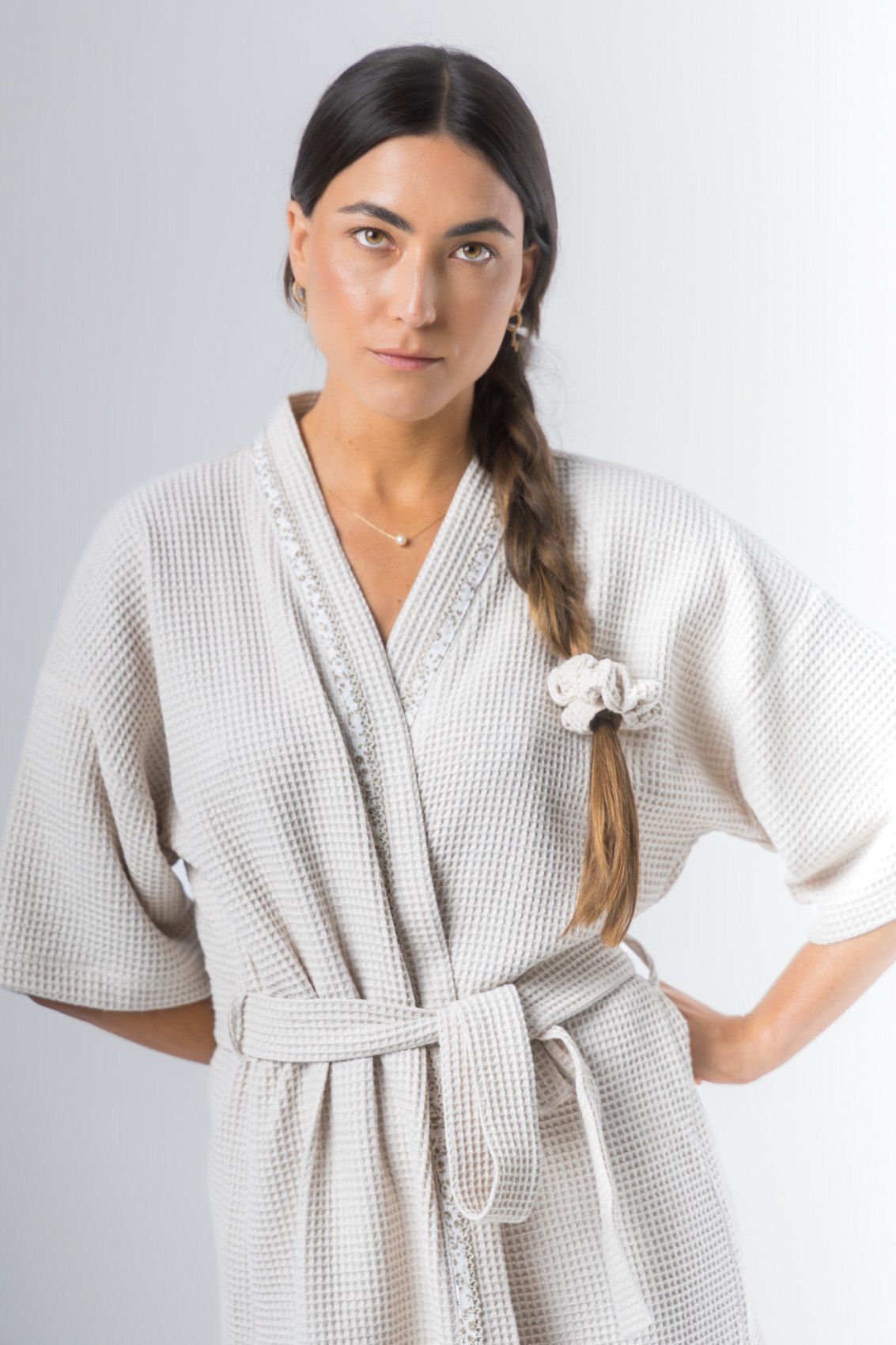Kimono confeccionado en tela waffle de algodón, manga al codo, largo arriba de la rodilla. Detalle de vivo en solapa. Lazo de tela waffle de algodón.