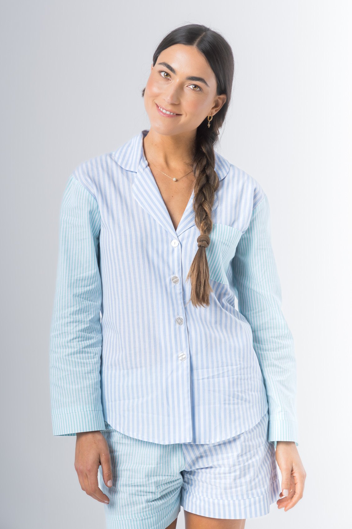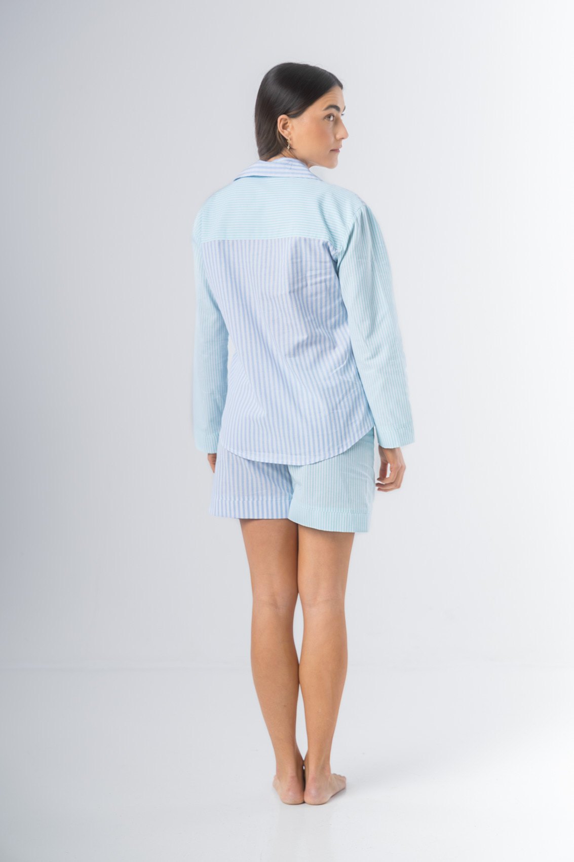 Pijama confeccionado en algodón estampado. Camisa manga larga abotonada adelante. Short con elástico en la cintura.