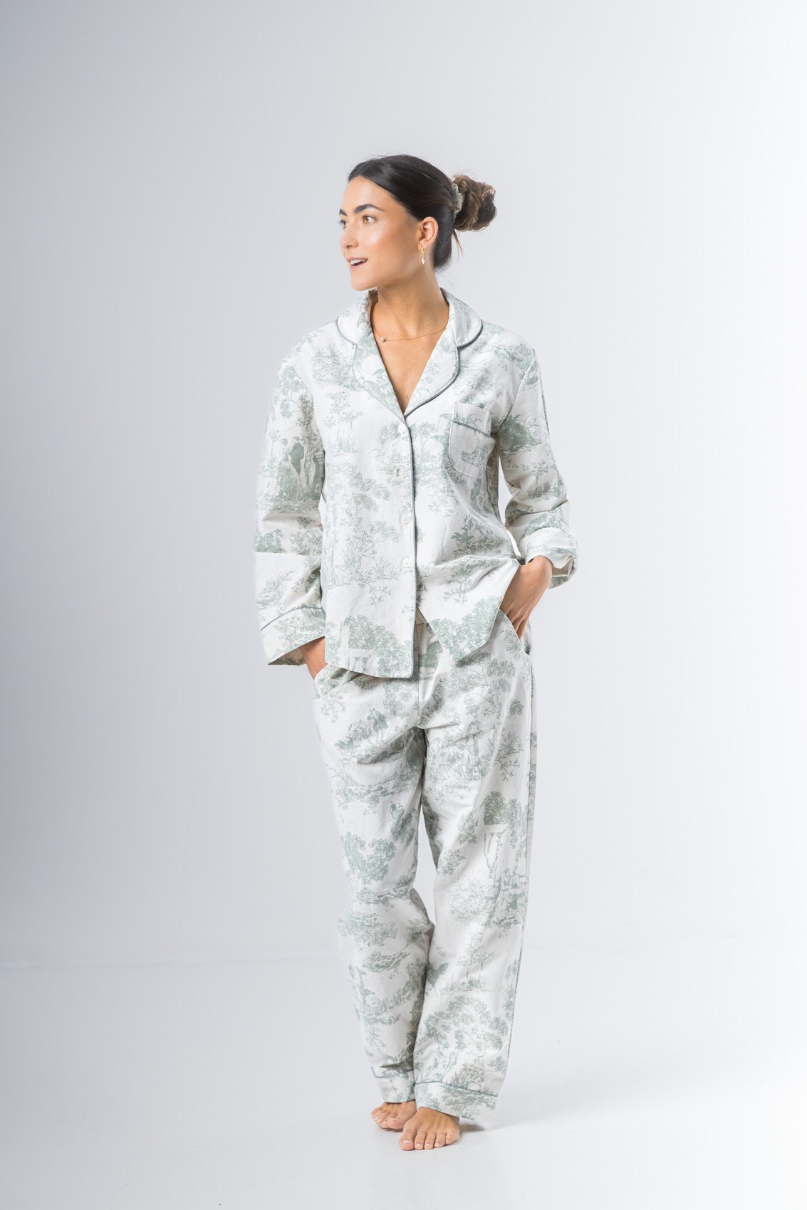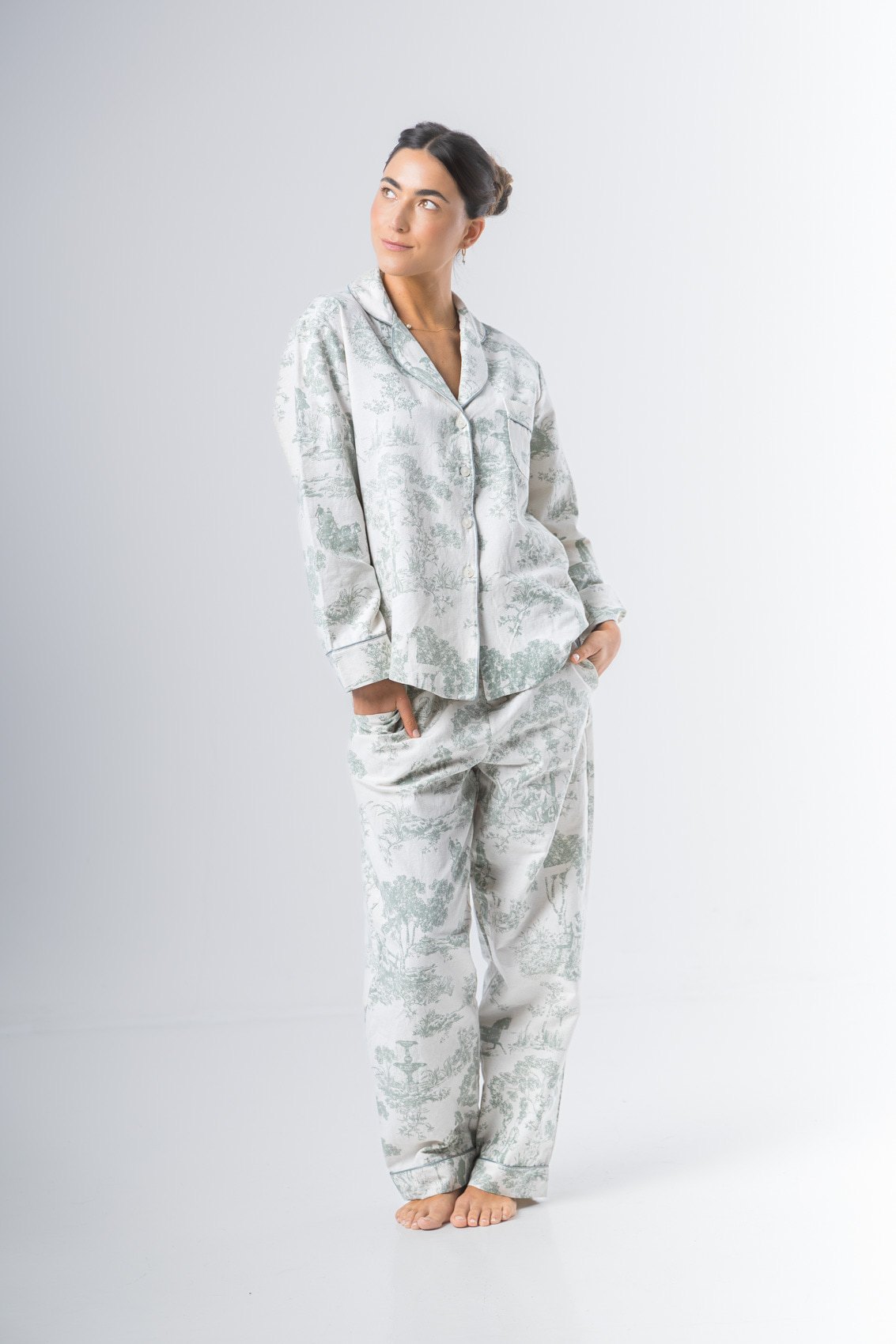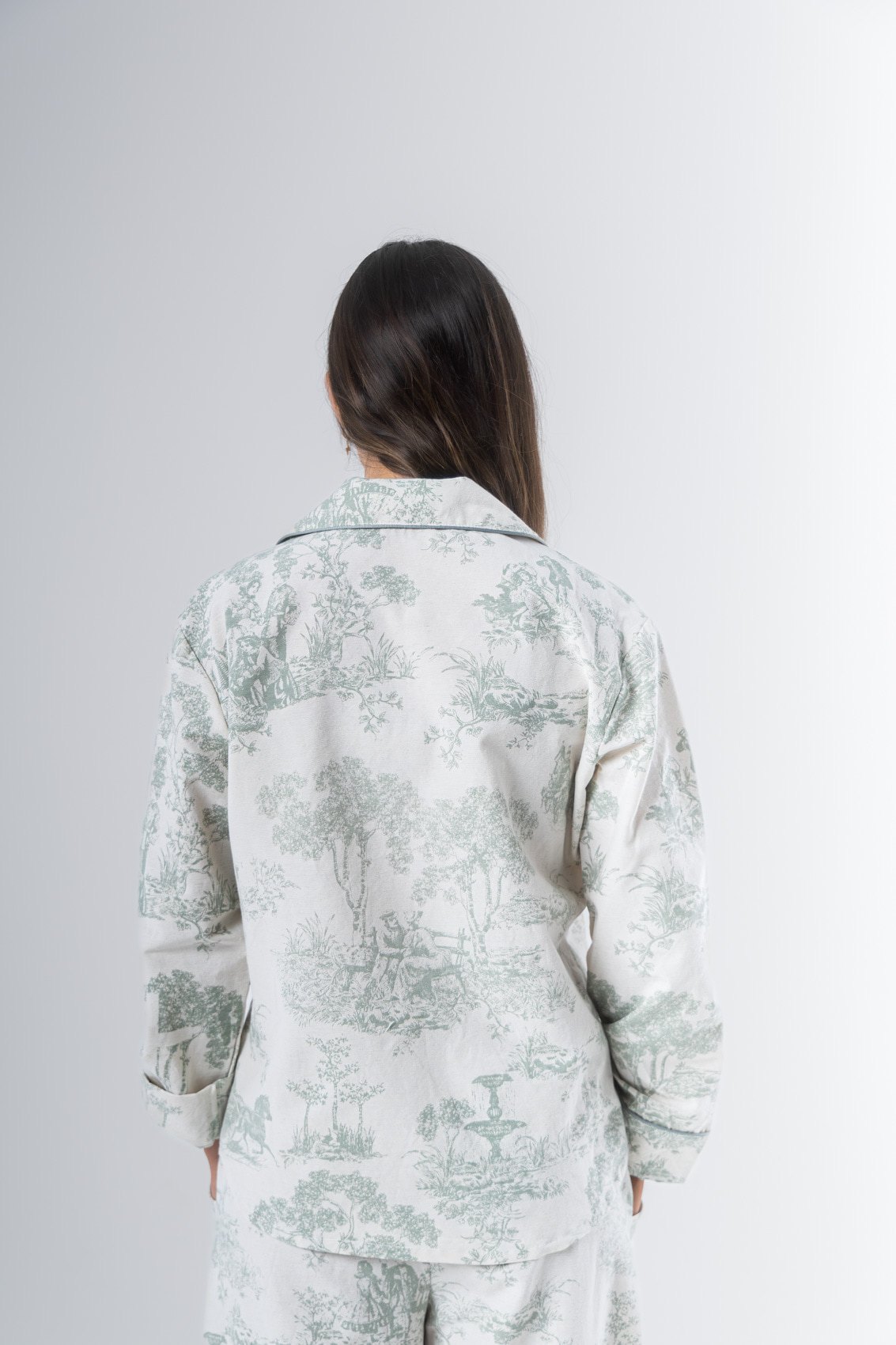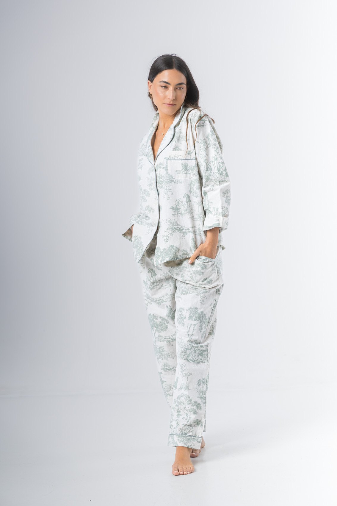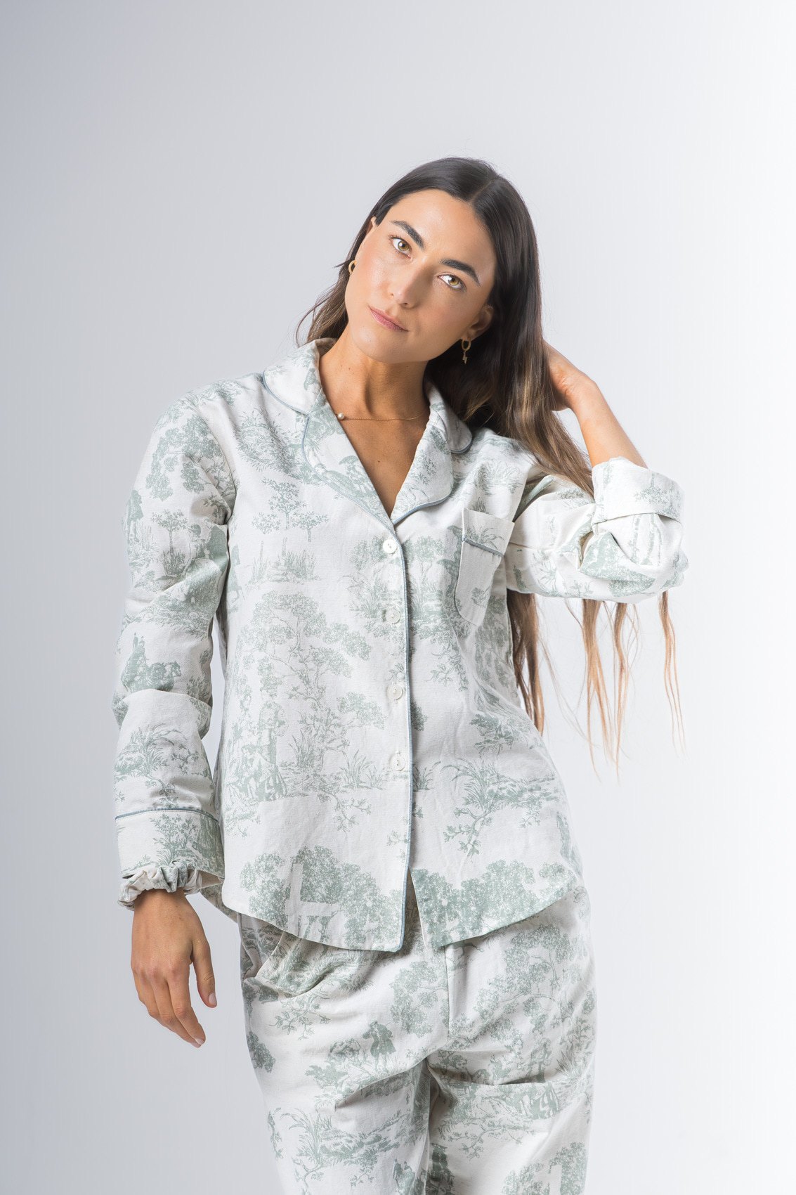 Pijama confeccionado en algodón estampado. Camisa de manga larga abotonada adelante con vivo. Pantalón recto con elástico en la cintura.